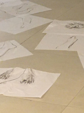 "Em 'Papel do Corpo', a artista Mery Horta, com a ajuda do público, defuma o espaço da Galeria Aymoré com palo santo. Em seguida, com a parte queimada da madeira, ela faz desenhos do seu corpo sobre o papel de seda, utilizando técnicas de impressão, além de estabelecer uma relação sonora, erótica e ritualística com o papel.